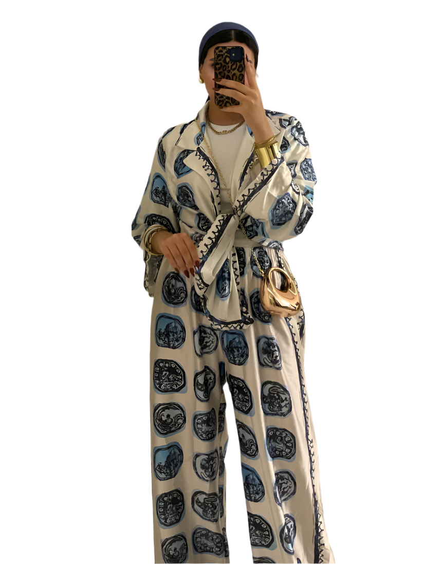 The trousers offer a relaxed, wide-leg fit that moves with you, while the clean, minimalist lines of the blouse balance the bold print with a modern touch. Whether you're heading to a coastal escape, enjoying a city stroll, or dressing up for a casual outing, the Ocean Drift Set is made for those who love to stand out with grace.