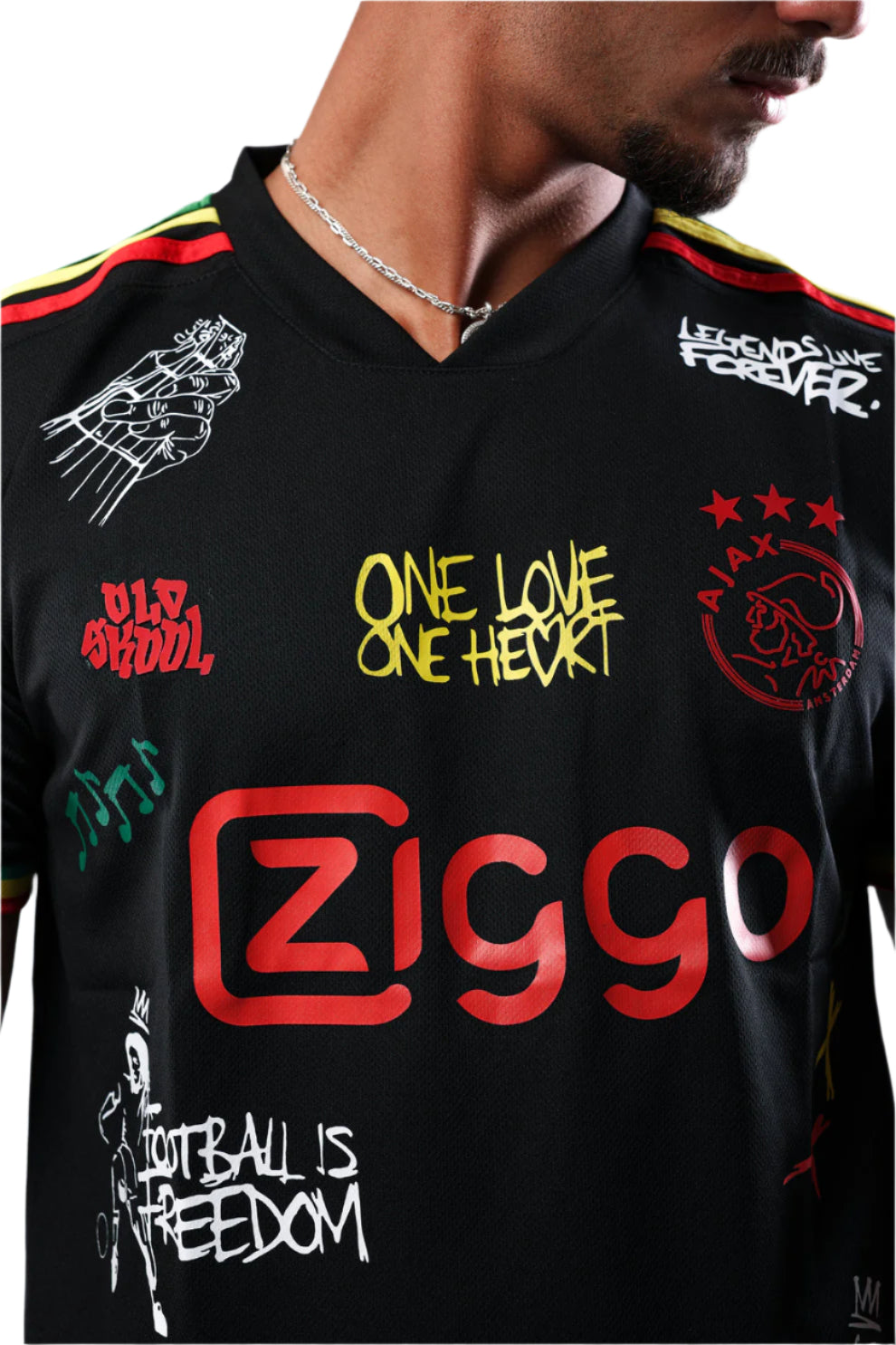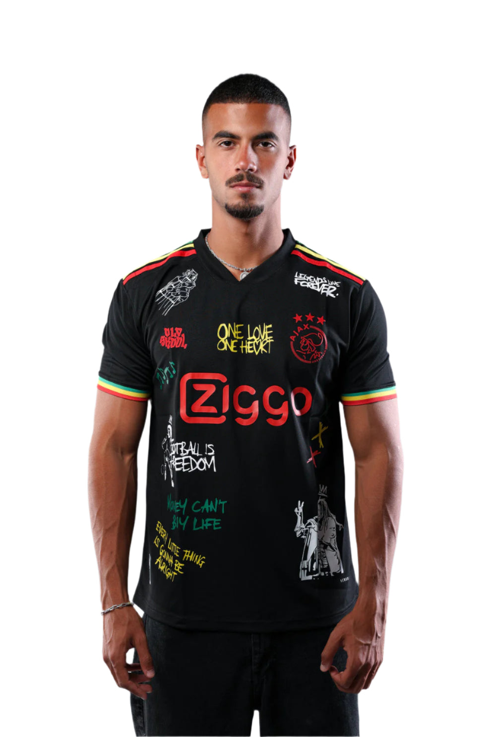 Where streetwear meets spiritual resistance. One Love Rebellion reinvents the classic Ajax away shirt into a vibrant canvas of culture, unity, and bold expression. With reggae-inspired accents, graffiti-style tags, and rebellious quotes, this jersey speaks louder than words — a true statement of passion and identity.