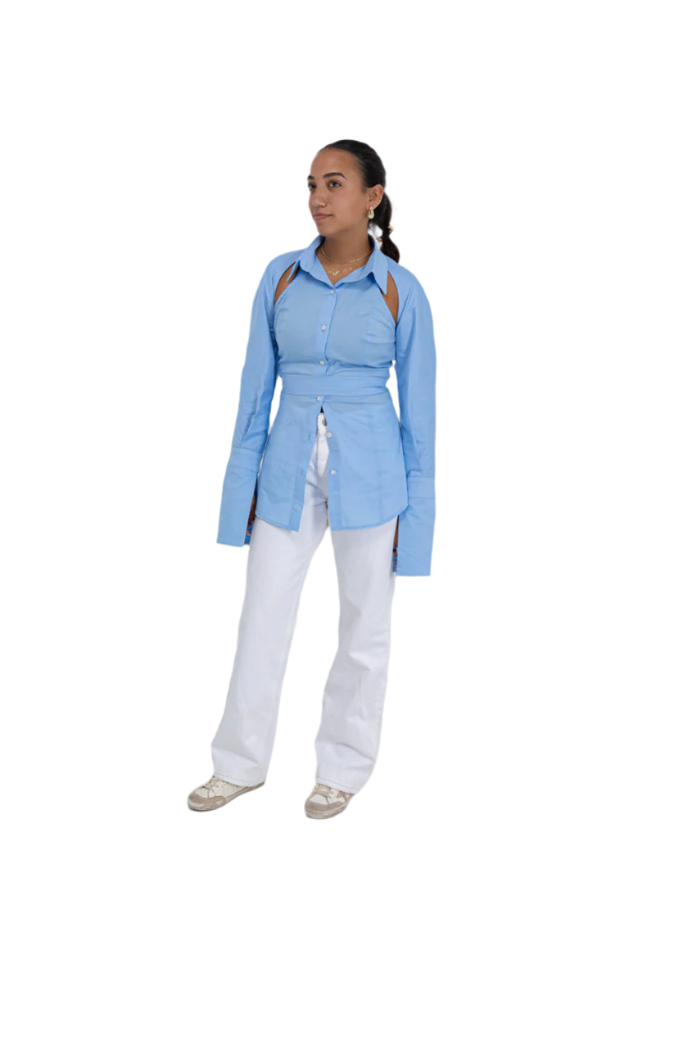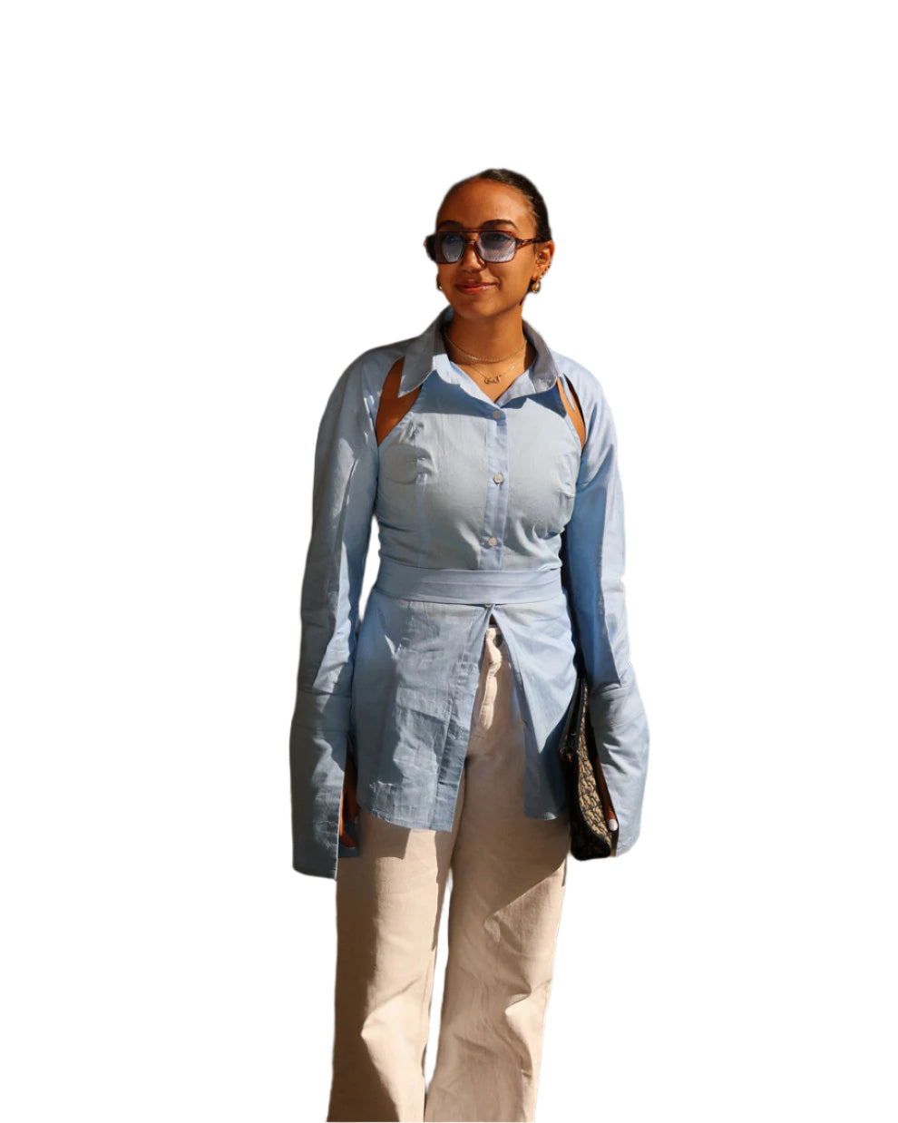 A bold twist on the classic shirt — this convertible chemise features sharp shoulder cutouts, a cinched waist, and detachable sleeves, transforming it from a long-sleeve shirt to a chic vest in seconds. Elegant yet versatile, it adapts to any vibe — from statement workwear to casual cool.